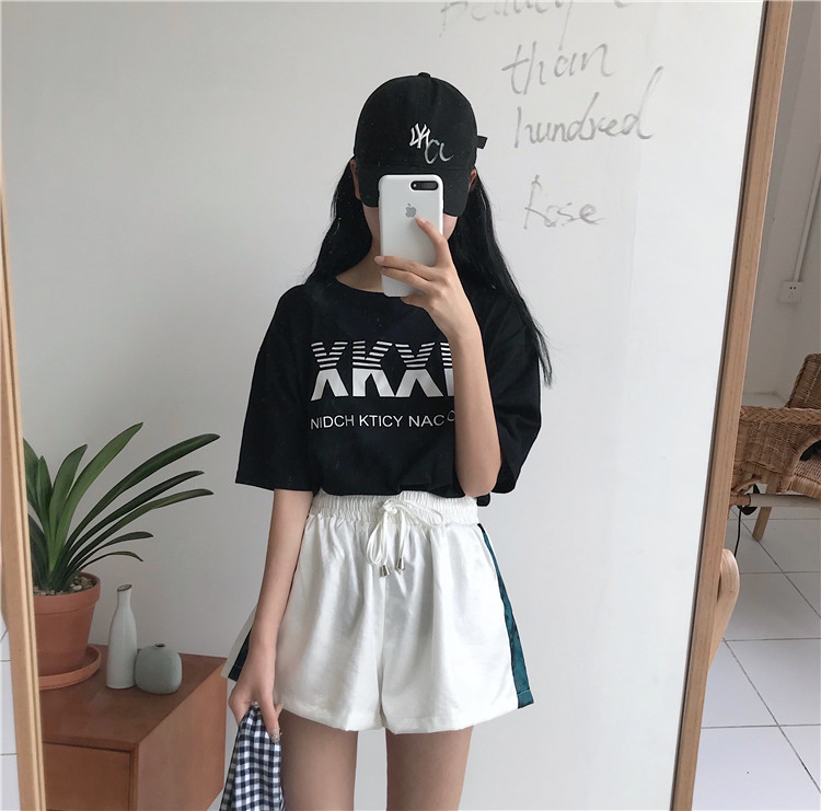 韓版百搭休閑系帶撞色松緊腰系帶闊腿褲短褲 女裝