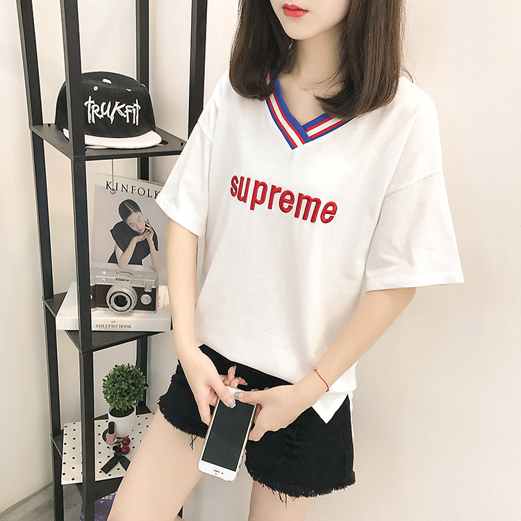 女裝t恤純棉V領(lǐng)刺繡字母ulzzang短袖T恤上衣