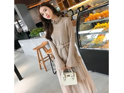 套裝連衣裙2018春季新款女韓版木耳邊高領(lǐng)a裙兩件套中長(zhǎng)款紗