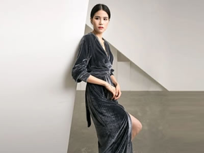 秋冬長(zhǎng)袖性感v領(lǐng)小心機(jī)設(shè)計(jì)師品牌絲絨綁帶開高叉金絲絨連衣裙
